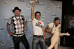 On August 17, 2009, the group released "Cha-Ching" which serves as the first single from their third album.[41] The peaked at number six on the Canadian Hot 100.[33] The second single, "Don't Talk to Strangers" peaked at number 11 on the Canadian Hot 100.[33] On November 17, 2009, Hedley released their third studio album The Show Must Go.[42] The album peaked at number six on the Canadian Albums Chart and was certified double platinum in Canada.[20][21] The album earned a Juno award nomination for Pop Album of the Year in 2010. The band was also nominated for Group of the Year.[22] The third single "Perfect" peaked at number seven on the Canadian Hot 100.[33] The song also reached number 25 on the US Adult Top 40 chart, marking the group's first charting song in the US.[43] The song was nominated for Single of the Year and won Video of the Year at the 2011 Juno Awards.[22][44] The fourth single off the album was "Hands Up" and reached number 27 on the Canadian Hot 100.[33] "Sweater Song" was released as the fifth single and peaked at number 63 on the Canadian Hot 100.[33] The band went on The Show Must Go... on the Road Tour across 38 cities in Canada in promotion of the album The Show Must Go with supporting acts from Fefe Dobson, Stereos, Faber Drive and Boys Like Girls.[45] A live album and documentary Go with the Show was recorded during this tour and was released on November 9, 2010.[46] The Show Must Go was nominated for Album of the Year at the 2011 Juno Awards.[22]
