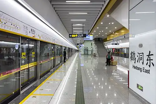 Hedong East Station (simplified Chinese: 鹤洞东站; traditional Chinese: 鶴洞東站; Cantonese Yale: Hokdúngdūng Jaahm) is a station on Line 11 of the Guangzhou Metro. It started operations on 28 December 2024.[1] It is located underground at the intersection of Fangcun Avenue South[2] and Lixin 1st Street[3] in Liwan District.[4]