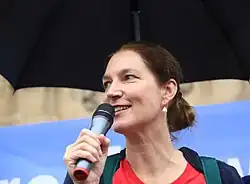 Alongside Beatrix von Storch, she organized the Demo für Alle rallies, focused on protesting the 2015 education plan of the liberal government of Baden-Württemberg, same-sex marriage, "gender ideology", and demanding the protection of "traditional values".[8][9] The protests turned violent and led to police arrests.[10] An outspoken opponent of same-sex marriage and teaching gender studies in public schools, the LGBTQ network Enough is Enough! Open Your Mouth! accused her of using hatred and fear against LGBTQ people, referring to her as Miss Homophobia in 2015, stating that she is one of "the most active representatives of fear and hatred towards lesbians and gays in Germany." She has suggested that same-sex couples, unlike heterosexual couples, cannot be faithful for life.[11]