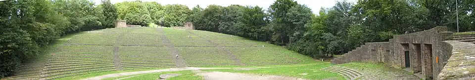 The Thingstätte was located in Heidelberg partly as a counterpart to a cemetery of honour for the fallen of the First World War that was created on another peak above the city.[11] Together with the Reichsfestspiele, one of its purposes was to present a picture of Nazi culture to foreign visitors; however, by the time it opened the Thing movement had already begun to fall out of favour, and in summer 1936, the Mayor of Heidelberg announced its renaming from Thingstätte to Feierstätte (celebration site).[12][13] It was used for the première of Kurt Heynicke's Der Weg ins Reich during the 1935 Reichsfestpiele,[14] and for further dramatic productions and seasonal celebrations until the siting of a flak tower there precluded planned use for a theatrical training programme in 1942.[1]