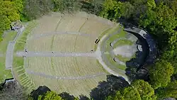 The Heiligenberg theatre is one of the official Thingstätten or Thingplätze built in the first part of the Nazi era as part of the Thingspiel movement. It is in the form of an egg-shaped amphitheatre and has a capacity of approximately 8,000 seats or 15,000 standees. The architect was Hermann Alker. The original design was to seat 10,300 people with room for an additional 20,000 standees and include a dance ring behind the stage; work began in late April 1934 and was to have been completed in July, but paused and resumed on the reduced plan, and the facility was completed in June 1935 and dedicated on the 22nd of that month.[1][2] Approximately 20,000 people attended,[3] and in his address to them Joseph Goebbels spoke of the 'holy mountain' that was the site and characterised the Thingstätten as "the Lagtagen [State diets or parliaments] of our time";[4] he described the theatre as "National Socialism in stone" and compared the construction of Thingstätten to that of the autobahns.[5] The opening festivities concluded with a summer solstice celebration during which Franz Philipp's cantata Heiliges Vaterland was performed.[1][6] Originally, the theatre was to have been the venue for the première of Richard Euringer's German Passion 1933 during the Reichsfestspiele theatre festival in Heidelberg in 1934; since the theatre was not ready, the performance instead took place in the courtyard of Heidelberg Castle.[7]