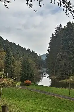 The Heimbach has its source southwest of the Schramberg district Waldmössingen in the district of Rottweil and then flows in a largely northern direction through the community Fluorn-Winzeln, past the Alpirsbach district Römlinsdorf and the Dornhan district Busenweiler. Afterwards it crosses the area of the Lossburg community. After the district Wälde the small river changes its direction of flow towards the east towards the Glatt. It now flows in an arc around the district Sterneck through a wooded valley, feeds a small dam below Sterneck, which is somewhat hidden in the woods, and then flows into the Glatt in the Dornhan district Leinstetten.