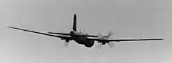 The He 177B-5's first-built prototype, the He 177 V101,[49] was converted from a mid-production He 177A-3 airframe (number 535 550, with Stammkennzeichen of NN + QQ),[50] the V102 being converted from the eighth He 177A-0 production prototype aircraft (which required the He 177A-3 specification aft fuselage lengthening), and the V103 being converted from an existing, early production He 177A-5 airframe, with all three airframes initially retaining the production 177A-style single vertical tail surfaces. Although no photographs are known to exist verifying their fitment, the general arrangement Typenblatt drawing for the V101 airframe — bearing the "B-5" subtype designation within the drawing's title block[51] — showed that it was intended to be uniquely fitted with a small-area matching vertical pair of so-called pivoting "drag rudders" mounted, one per side, a short distance in from the horizontal stabilizers' tips, directly inline with the inner engine nacelles, to simulate "engine-out" conditions. Each of the pivoted "drag rudders" were to have their area divided equally above and below the plane of the stabilizer. Because flight testing had revealed that the single-tailed V101 exhibited an increasingly serious stability problem with higher airspeeds, the subsequent prototype, the V102, was both the first He 177B example to fly, on 20 December 1943, with the quartet of DB 603 engines, in combination with a brand-new empennage of twin tail configuration, fitted to it during the early autumn of 1943. When the V102 was tested later that autumn while still flying with its A-series wing and powerplants before its own pair of B-series "four-engine" wing units were ready, the new twin vertical tails gave the V102 significantly better in-flight handling compared to the original 177A-style empennage of the V101, except during the landing approach when the Fowler flaps were extended during its own initial flights with the twin tails in November 1943.[52] On 24 February 1944, as the USAAF's Big Week strategic bombing campaign against Germany continued, particularly against targets in northern France involving V-weapons installations — a meeting was held at the all turf-surfaced Wiener Neustadt military airfield. Erhard Milch, and fellow guests Oberst Edgar Petersen and Oberstleutnant Siegfried Knemeyer (Göring's top aviation technology expert), each had a chance to fly the now four-engined V102 prototype after the B-series set of wings had been fitted. Knemeyer stated that he could not believe a four-engined heavy bomber could possess the "excellent handling qualities" that the V102 displayed.[53] The only verifiable wartime photograph of any of these He 177B prototypes in an intact condition is one of the V101, parked outdoors on a foggy German airfield,[54] most likely the Heinkel-Sud factory airfield at Schwechat.[55][56] One additional surviving photo, showing what looks like a He 177B-series prototype from the right side with a production-style A-series single vertical tail surface set, and bearing the Stammkennzeichen code of NE+OD,[57] does not match any item of the surviving documentation for the four known 177B-series prototypes ordered, built or flown before the end of the war,[58] and possessing one of the upgraded, upright-seating A-5 subtype's tail gunner's emplacements, as well as the usual twin dorsal turret defensive armament of the He 177A-5 subtype.