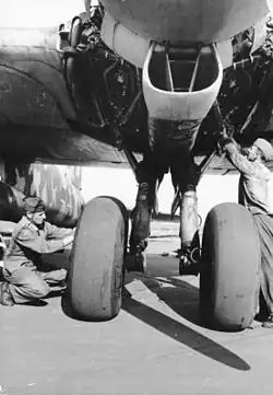 During development, the anticipated weight of the He 177 increased so much that a main undercarriage design sufficient to handle the 32 metric tons (35 short tons) loaded weight, was difficult to achieve. The engine nacelles and wings had little room for the main undercarriage members, which needed to be longer than usual, for ground clearance for the large diameter four-blade counter-rotating propellers. After several extremely complex arrangements had been considered during initial design, a novel system was adopted. Instead of a wheel leg under each engine nacelle, two-wheel legs were attached to the main spar at each nacelle, the outboard legs retracting upward and outward into shallow wing wells and the inboard legs swinging upward and inward into similar wells in the wing roots, with all units enclosed by flush fitting wheel and strut doors, which almost met under each engine nacelle when fully extended. During the retraction cycle, the forward-oriented lever-action lower gear strut sections (onto which the wheels were mounted on their axles), pivoted backwards to a 90° angle from 120° when fully extended. This was in order to position the wheels to fit into the wheel wells during the sideways folding action.[16] A conventional rearwards-retracting single-leg twin wheel arrangement for each main gear, a design heavily influenced by the He 219's similar main gear components, was used on the two prototypes built (one during the war, one post-war) of the He 274 in France. Drawings were made for a tricycle gear arrangement for the four-BMW 801E radial-engine powered Amerikabomber entry version of the proposed He 277 by February 1943, which was also depicted with single main gear struts with twin wheels.[17] For the He 177A's own landing gear maintenance needs, some two hours were required just to change a main gear tire, using special Heinkel-designed 12 metric tons (13 short tons) capacity main gear jacks and blocks.[18]
