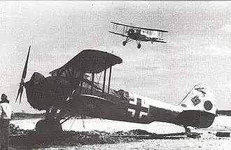 In spring 1943, following the success of the Soviet VVS's Night Witches units against the Wehrmacht Heer's frontline encampments while flying their Polikarpov Po-2 biplanes on nocturnal harassment raids, surviving He 50s were rounded up from training schools and delivered to night ground attack units operating on the Eastern Front.[2] The He 50 was used to conduct night harassment sorties on the Eastern Front until October 1944, when the units were disbanded.
