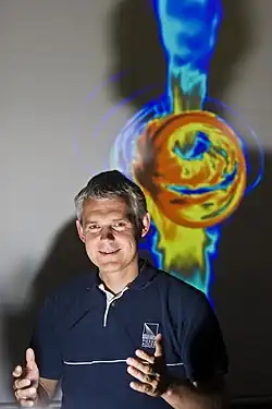 Heino Falcke (born 26 September 1966 in Cologne) is a German professor of radio astronomy and astroparticle physics at the Radboud University Nijmegen (Netherlands).[1] His main field of study is black holes, and he is the originator of the concept of the 'black hole shadow'.[2] In 2019, Falcke announced the first Event Horizon Telescope results at the EHT Press Conference in Brussels.[3]