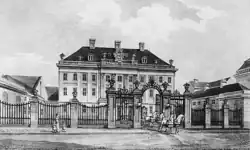 His father Diedrich Jacob was a merchant and city councillor in Demmin, Swedish Pommerania, who sent him out learning the trade in Stettin.[1] In 1746 he set up a supplies store in sugar, coffee and tobacco in Dresden. On 4 March 1747, at the age of 23, he married then 17-year-old Caroline Tugendreich Friedeborn. In 1755, Schimmelmann was responsible for tariff collection in Kursachsen. By the end of 1756 he delivered grain and flour to the Prussian army and was appointed as Geheimrat. In December 1756 or 1757 he bought pillaged Meissen porcelain from the Prussian king, which were shipped in 110 cases to Hamburg, and auctioned on 11 July 1758.[2] (He secretly returned a part to the Saxon king August III.[3]) In April Frederick the Great ordered him to contact Veitel Heine Ephraim and Daniel Itzig and deliver silver to the two mint masters who were leasing all the Prussian mints.[4] Already in July 1758 Schimmelmann leased the mint in Schwerin (Mecklenburg) from Frederick II, Duke of Mecklenburg-Schwerin and started to compete with Ephraim & Itzig. Schimmelmann produced debased coins, but with a higher silver content than the debased Prussian coins.[5] Schimmelmann employed more than a hundred people at the end of 1759; one year later already almost 300 people.[6]