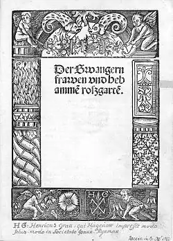 Little is known about Gran's life other than that he introduced printing to Haguenau, then a more important city than today. Between 1501 and 1527 he printed 213 works of mostly theological content.[1] The municipal library of Haguenau owns a collection of about forty incunabula from his workshop, signed with the monogram HG, and showing sometimes the emblem of the city, the rose. He printed the Epistolæ Obscurorum Virorum, among other works. One of Gran's most important clients was the pioneering publisher Johann Rynmann of Augsburg, who financed the printing of 174 out of the 213 works issued by his press between 1501 and 1527.[1] Many of Gran's books were destined for Hungary.[2] Gran also seems to have worked sometimes with his junior, Haguenau printer Thomas Anshelm.