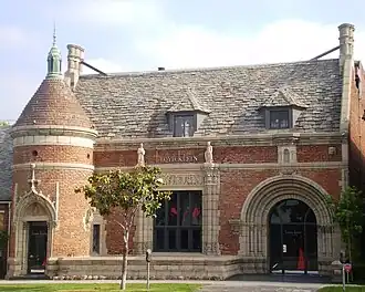 The castle-like building was built in 1928 for noted muralist Anthony Heinsbergen (1894-1981), and designed by Curlett & Beelman in a Late Gothic Revival and Romanesque style. The building's notable features include the prominent cylindrical tower, a Renaissance-style mural in the tower arch, and the detailed friezes displaying artisans at work. At least 11 buildings designed by architect Claud Beelman have been listed on the National Register. The building was constructed while Heinsbergen was employed to create murals for Los Angeles City Hall, and he had his building on Beverly Boulevard built using bricks from the old city hall.[3]