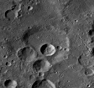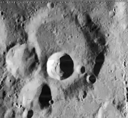 Heinsius is an eroded lunar impact crater that lies in the southwestern part of the Moon. It is named after German astronomer Gottfried Heinsius.[2] It is located to the northwest of the prominent crater Tycho, and rays from that formation pass to the north and south of Heinsius as well as marking the rim and interior with material. To the south-southwest of Heinsius is the larger walled plain Wilhelm.