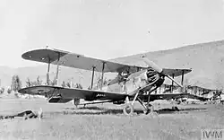 Soon, the king ordered new aircraft from both Italy and the United Kingdom for his new entity, which was also called the Hejaz Flying Corps.[6] The first, two Airco DH.9 and two Armstrong Whitworth F.K.8 bombers, along with four spare engines, were exported by Hugo Schumacher of Schumacher & Lavison in Cairo and arrived on 6 August 1921. They were followed on 16 August by the arrival of six French aircraft licence-built in Italy, four Le Rhône-powered Caudron G.3bis general purpose aircraft and two Fiat-powered Fiat SIA.5 trainers. The Caudrons were originally claimed to have been procured for Somaliland to introduce an airmail service but were redirected and sold by Tullio Pastori to bolster the new air force. There was proposed purchase of French SPAD aircraft at the same time, but none were delivered.[7] Two further German aircraft, identified as an 'A G' and an 'Albatross', were in Medina in 1921.[8] They were likely to be an AEG C.IV spotter and an Albatros D.III scout left in the new country by the retreating Ottoman Aviation Squadrons, but there is no record of either being airworthy or flying.[7]