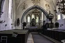 Internally, the church is decorated by murals; one set dating from circa 1250 and another, by the so-called Master of the Passion of Christ (Passionsmästaren), from the 15th century. There are two baptismal font in the church; one from the 13th century, the other is baroque and from 17th century. A crucifix with a ring cross hangs in the triumphal arch and is dated to around 1250. The pulpit dates to 1704. The altarpiece was added in 1738.[3]