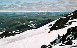 Hekla is a popular destination for hiking. Following the most recent eruption the path goes most of the way to the summit;[56] the walk takes 3 to 4 hours.[9] In spring, skiing is possible on short routes around the rim of the crater. In summer, there are easy (F) mountaineering routes also around the crater rim,[57] and it is possible to snowcat to the top in winter. The volcano can be reached using the buses to Landmannalaugar 30 km (19 mi) further east, and it is possible to stay or camp at farms in the area.[58] A visitor centre, The Hekla Center at Leirubakki Farm, opened in 2007.[59]