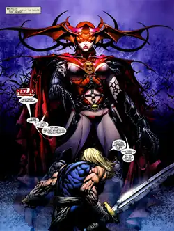She is seen attending a meeting with Mephisto, Blackheart, Satannish and Dormammu about a disturbance created by the newly resurrected Magik, who is looking for the soulsword and the original Bloodstone amulet. Belasco's daughter Witchfire appears during the meeting and reveals she is now the current owner of the original amulet and vows to take her father's place as ruler of Limbo and seat at their table.[35]