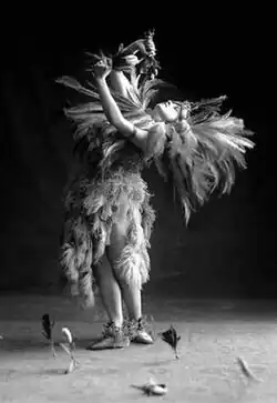 Huara's dances were described as a fusion of Peruvian folklore and Spanish techniques, using castagnets and sinuous, snake-like movements, proving a technical skill that was hypnotizing and bewitching.[15] Performed to modern music composed by artists like Arthur Honegger and Vincent d'Indy, she balanced her wild "Incan" abandon with the bohemian music and style of the period.[16] Huara designed her costumes and even took films of her movements in slow motion to patent her dance moves.[17] In 1930, she played in the musical Nina Rose, at the Majestic Theatre.[18] The following year, she was the subject of photographs entered in the Rochester International Salon of Photography by Dr. Max Thorek.[19] Suffering from a nervous disorder and increasing deafness, Huara and More left the United States for Paris.[2]