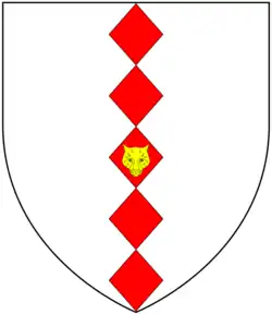 Arms of Hele: Argent, five fusils in pale gules on the middle one a leopard's face or