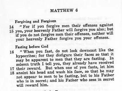Montgomery's translation was notable for her practice of inserting chapter and section titles (as seen in photo), a pioneering feature now commonly used in Bibles in many languages. She included interpretations supporting enlarged roles for women in the church, which was influenced by her reading the works of Katharine Bushnell, a Methodist missionary.[7] (Bushnell's work was rediscovered by theologians in 1975.) Montgomery had reviewed an edition of Bushnell's collection God's Word for Women in 1924, but likely first came across the work when it was published in 1919.[7] Bushnell's influence is seen in Montgomery's translating 1 Cor.11:13-15 as statements rather than questions (as formerly interpreted by others), as illustrated below with comparisons between the New American Standard Bible and the King James Version. In addition, her notes to Rom 16:2 and to I Cor. 14:34 show her "familiarity" with Bushnell's argument.[8]