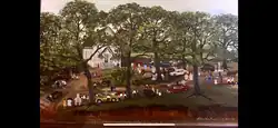 Not limited to two-dimensional media, LaFrance was an exceptional quilt maker and wood carver of animal sculptures and articulated dolls with handmade textile clothing. But it is her memory paintings that most strongly suggest a common experience. "Simply described, memory painting is a visual history of reminiscences coming from a particular frame of reference."[3] Her sense of time and place resonate with the emotions and memories of the viewer, pulling them in. With oil on canvas, LaFrance shared the traditions of family and church and the values she grew up with, and recollections of coon hunts, fishing, planting and picking cotton and tobacco, growing flowers and using their petals for paint, the general merchandise store, barn dances, the circus, fish fries, family reunions, and church picnics where the community gathered together. She witnessed the Depression, the 1929 stock market crash, the war in Vietnam, and the passing of the Civil Rights Act of 1964 and the Voting Rights Act of 1965. LaFrance's blend of personal experiences and expressive artistry in her paintings have left an emotional impact on viewers.