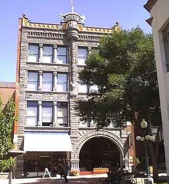 Helena's early commercial district was located along State, Edwards, and Broadway Streets, but fires destroyed much of this area in 1869, 1872, and 1874. Much of what was built afterwards was built in the Western Commercial style, with splendid brickwork and simple lines. The Beaux Arts Parchen Drug Building, Colwell Building, and the Penn-Block Bristol Hotel were French Renaissance. The Denver Block and Sands Brothers Dry Goods were Romanesque Revival.[3] By the mid-1880s at least 18 architectural firms had been established in Helena or called in from back East. Several of these architects were part of or influenced by the Chicago school of architecture. This influence is seen in the Atlas Building, Securities Building, Power Block, and the Lewis and Clark County Courthouse.[5]