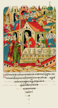 Helena's Orthodox faith created a number of complications. Alexander had to receive a special permission from Pope Alexander VI to marry a non-Catholic and sign a formal agreement with Ivan III in October 1494 that Helena would not be forced to convert. Alexander wanted to add that if she wished so herself, Helena could convert, but Ivan III adamantly rejected the amendment.[12] Ivan III left Helena with detailed instructions on how to behave, whom to invite for lunch, where to pray (she was prohibited from visiting Catholic churches).[13] Ivan III also requested that Alexander would build an Orthodox church in Vilnius Castle Complex. In January 1495, Helena, accompanied by eighty nobles and servants, departed Moscow towards Vilnius.[13] She reached Vilnius on 15 February 1495 and the same day the couple was married. The marriage ceremony was a complex combination of Catholic and Orthodox traditions. Helena prayed and prepared in the Cathedral of the Theotokos before moving to Vilnius Cathedral.[13] She was dressed in a traditional Russian wedding dress. The wedding ceremony was officiated by Catholic Wojciech Tabor, Bishop of Vilnius, and Orthodox Foma, priest who accompanied Helena from Moscow.[14] Reportedly Helena did not bring much dowry (jewelry, three icons, silver and gilded dishes, expensive fabrics, furs, a carriage with horses) and Alexander did not gift her with lands after the wedding (he did so only in August 1501).[15]