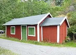 The boathouse is down at the lakeside. The other three buildings, all on the historic register, all have wood-panelled walls painted yellow with green details. There is also a small gazebo. The main house (Lilla Skuggans väg 73) stands highest on the slope and is largest, with 276 square metres (2,970 sq ft) of living space. Lilla Skuggans väg 71, to the south, has 133 square metres (1,430 sq ft) and Lilla Skuggans väg 75, below that to the east, has 77 square metres (830 sq ft).[10]