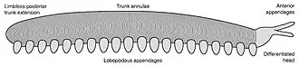 While originally thought to have more or less,[2] Helenodora is now known to possess 20 pairs of legs known as lobopods. In complete specimens with a differentiated front and back, this number is certain.[3] These lobopods are preserved as stubby triangles that taper off towards the end.[2] They had a mean length of 1.7 millimeters, and a mean width at their base of 2.1 millimeters.[3] Other than a single leg on the paratype (appendage 11), none of Helenodora’s lobopods preserve any part of the cuticle. However, even where it exists, the cuticle is poorly preserved. Because of this, whether the lobopods had any annulations or limb ornaments is unknown.[2][3]