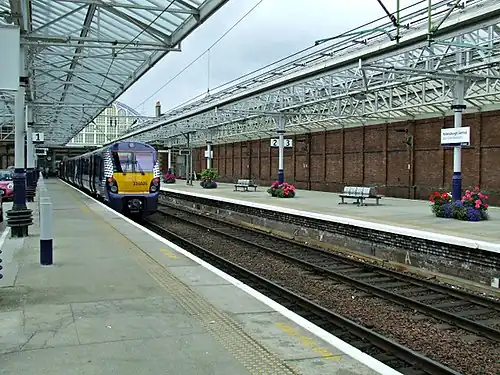 Helensburgh Central railway station (Scottish Gaelic: Baile Eilidh Meadhain) serves the town of Helensburgh on the north shore of the Firth of Clyde, near Glasgow, Scotland. The station is a terminus on the North Clyde Line, sited 24 miles 31 chains (39.2 km) from Glasgow Queen Street (High Level), measured via Singer and Maryhill.[5] Passenger services are operated by ScotRail on behalf of Strathclyde Partnership for Transport.