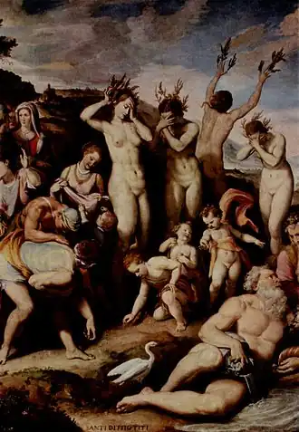 According to one version recorded by Hyginus, there were seven Heliades: Merope, Helie, Aegle, Lampetia, Phoebe, Aetherie and Dioxippe.[2] Aeschylus's fragmentary Heliades[3] names Phaethousa and Lampetia, who are otherwise called daughters of Neaera.[4] Homer in the Odyssey gives their names as Phaethusa (Φαέθουσα) and Lampetia (Λαμπετίην); a scholion adds Aegle (Αἴγλην).[5]