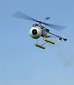 The Helicam is a remote-controlled mini helicopter used to obtain aerial pictures or motion images using video, still or motion film cameras.[1] The remote controlled camera mount system allows pan, tilt and roll movements. A wireless onboard video transmitter downlinks the live signal to the camera operator, images can be recorded on board, on the ground or both. The system is controlled by two operators with independent controls: the helicam pilot and camera operator.[2]