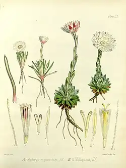 - ^ a b c d e f g Buchanan, A.M. (1987). "Helichrysum pumilum var.Spathulatum (Compositae: Inuleae), New From Tasmania". Papers and Proceedings of the Royal Society of Tasmania. 121: 53–56. doi:10.26749/rstpp.121.53.