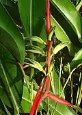 The simple leaves of these plants are 15–300 cm (6 in–10 ft). They are characteristically long, oblong, alternate, or growing opposite one another on nonwoody petioles often longer than the leaf, often forming large clumps with age.[7] The leaves in different positions on the plant have a different absorption potential of sunlight for photosynthesis when exposed to different degrees of sunlight.[8] They also look like lobster claws.