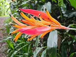 Heliconia psittacorum (parrot's beak, parakeet flower, parrot's flower, parrot's plantain, false bird-of-paradise) is a perennial herb native to the Caribbean and South America. It is considered native to French Guiana, Guyana, Suriname, Venezuela, Colombia, Bolivia, Brazil, Paraguay, Panama and Trinidad and Tobago. It is reportedly naturalized in Gambia, Thailand, Puerto Rico, Hispaniola, Jamaica and the Lesser Antilles.[2] It is often cultivated as a tropical ornamental plant in regions outside its native range.