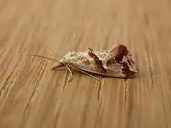 The wingspan is about 15 mm. Adults have silvery white forewings with patches of raised brown scales.[1]
