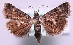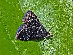 Heliothela wulfeniana has a wingspan of 16–19 mm.[4] The thorax and abdomen of these moths are brownish. Legs are whitish. The upperside of the forewings is dark brownish black, with small metallic lead-gray dots. A showy white spot is present on the paler brown hindwings. The outer margins of the wings are fringed with gray-bluish scales.[3]