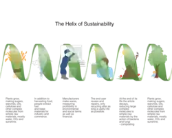The helix of sustainability is a concept coined to help the manufacturing industry move to more sustainable practices by mapping its models of raw material use and reuse onto those of nature. The environmental benefits of the use crop origin sustainable materials have been assumed to be self-evident, but as the debate on food vs fuel shows, the whole product life cycle must be examined in the light of social and environmental effects in addition to technical suitability and profitability.