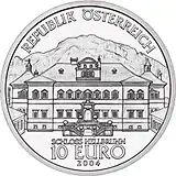 The castle is so popular and famous that it was the subject of a collectors coin: the Austrian 10 euro Castle of Hellbrunn Coin, minted on April 21, 2004. The obverse depicts the main access to the castle from its forecourt. In the background there are mountains of Salzburg on the northern rim of the alpine chain.