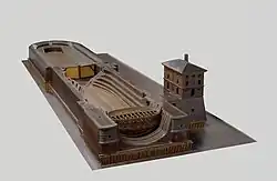 By fall 1802 the foundations of the dock were ready. On 29 September 1802 a marble stone with inscription was put in place as first stone of the dock.[8][9] On 17 April 1806 the dry dock was closed by placing the caisson door.[10] On 13 September 1806 the dock was opened by bringing in the frigate Euridice.[11]