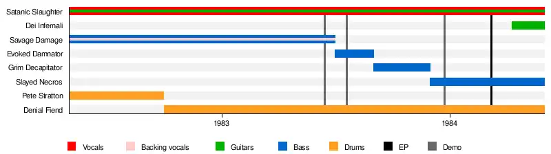 - Tom G. "Satanic Slaughter" Warrior (Thomas Gabriel Fischer) – guitar, lead vocals (1982–1984)