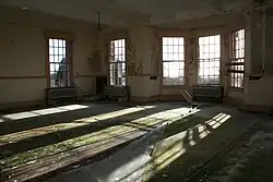 The main complex comprised an administrative block, central stores, kitchens, a recreation hall and the assistant medical officer's residence. Like most large institutions of that age and type, the sexes were separated into separate accommodation and work areas. To the west of the central block stood the male wards, workshops, boiler house, water tower and maintenance department. The female wards were located on the east side of the hospital along with the laundry, sewing room and a nurses' home. All of the buildings in the main complex were linked by an extensive network of corridors.[2]