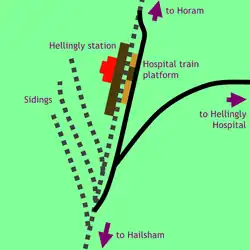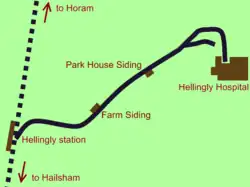 The railway left the Cuckoo Line at Hellingly Station. Although the railway joined the Cuckoo Line at both the northern and southern ends of the platform, virtually no through trains ran. Due to the arrangement of the lines at the junction with the Cuckoo Line, passenger trains to and from the hospital reversed south of Hellingly station.[6]