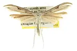 The wingspan is 27–33 millimetres (1.1–1.3 in). The forewings are white to pale yellowish white, although tinged with gray brown on the costa from the base to the apex. There is a blackish dash above the base of cleft, followed by one or two dots in a few specimens. The extreme apex of the first lobe is blackish and the apex of the second lobe has a blackish streak which is continued through the fringes. At a short distance before cleft is a small subtriangular brownish-black spot, curving toward the costal spot. There is sometimes a dot at the middle of the cell. The wing is sparsely sprinkled with dark scales which tend to collect along the veins and inner margin. The hindwings and fringes are gray brown.[2]