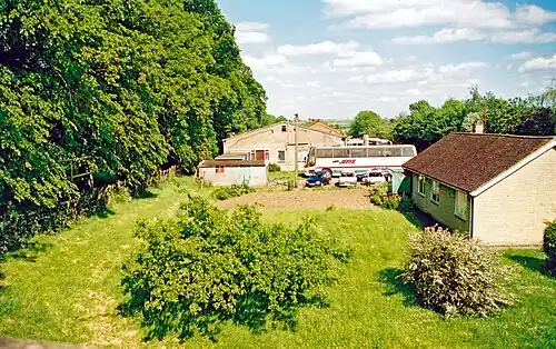 In August 1871 the Northampton and Banbury Junction Railway (N&BJ) extended its line from Towcester to Helmdon.[3] A station was erected in a shallow cutting spanned at its western end by a twin-arched road bridge carrying the village street (now known as Station Road) across the line. The station building and track layout was similar in style to that at neighbouring Wappenham: a one-storey symmetrical red brick building and a single loop siding on the Wappenham side, 100 yards (91 m) from the station, linked to the main line. Unlike Wappenham, Helmdon had a small red brick gabled goods shed which spanned the siding and contained a goods office and internal loading platform.[4]
