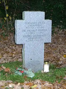 Friends arranged a fake appendectomy in a Copenhagen hospital to protect him from being arrested by the Gestapo. His stay in hospital was even prolonged with pyrogenic drugs. On the night of April 10/11, 1945, he tried to escape to Sweden by boat, but in vain. The boat was captured either by water police or by the marine coast-guard. Pfeiffer and his comrades were taken to Gestapo-HQ (Dagmar House) and subsequently transferred to Vestre Prison. On April 17, 1945, he was found strangled in his cell. Pfeiffer is buried in Copenhagen's Vestre Kirkegaard (E / 1 / 3071 1314). His grave is looked after by the German War Graves Commission.[5]