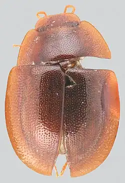 Small beetles (2.8 mm), strongly dorsoventrally flattened, orange-brown in coloration; pronotum and elytra laterally explanate. A more complete diagnosis was presented by Jennifer C. Girón and Andrew Edward Z. Short.[2]