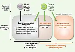 The spectrum of target antigens associated with tumor immunity and alloimmunity after allogeneic HSCT: Host-derived T and B cells can be induced to recognize tumor-associated antigens, whereas donor-derived B and T cells can recognize both tumor-associated antigens and alloantigens.