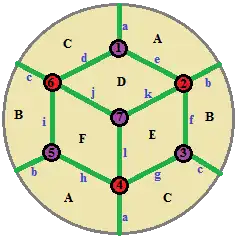 Its dual polyhedron is a rhombic hemi-dodecahedron which has 7 vertices (1-7), 12 edges (a-l), and 6 rhombic faces (A-F).