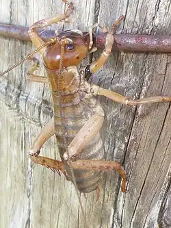 When eggs hatch they often do not do so all at once, a single batch of eggs may take up to two weeks to all hatch.[10] A female wētā can lay up to 200 eggs in her lifetime. It can take up to two years for juvenile wētā to mature and reach adulthood, during this time the young wētā must moult several times as it grows.[7] It does this by anchoring itself to a tree branch using its hind legs and hanging upside down. The thorax is the first part of the body to emerge, followed by the abdomen, then the head, next the front and hind legs are pulled out and the antennae emerge last. The Banks Peninsula tree wētā goes into a period of inactivity for a few days before moulting and lightens in colour.[10] After moulting the wētā consumes its exuviae, the shed skin, as this is made up of valuable proteins.