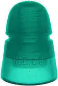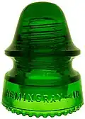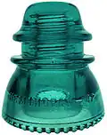 Hemingray was best known for producing telegraph and telephone pin insulators used on utility poles. To give an overview of the large variety of styles produced, the following table contains the twenty most common.[2] The table provides two numbers: the Consolidated Design (CD) number and the style number. The CD number is from a classification system developed by collectors that refers to the shape of the insulator, and is independent of the Hemingray Glass Company.[3] However, the style number (or name) was assigned by Hemingray to each insulator. Due to slight modifications in design over years of production, single styles can span multiple CD numbers.