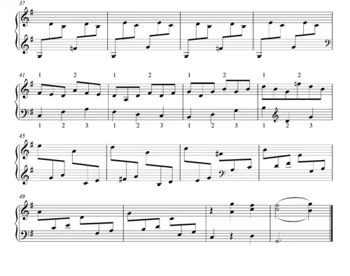 4), where a regular pattern of two beats to a measure is established at the start of a phrase, this changes to a pattern of three beats at the end of the phrase.