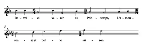 Hemiola is found in many Renaissance pieces in triple rhythm. One composer who exploited this characteristic was the 16th-century French composer Claude Le Jeune, a leading exponent of musique mesurée à l'antique. One of his best-known chansons is "Revoici venir du printemps", where the alternation of compound-duple and simple-triple metres with a common counting unit for the beat subdivisions can be clearly heard: